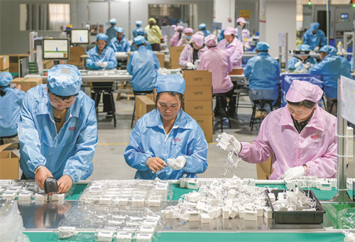 12月17日,在道县高新技术产业开发区,工人在适配器生产流水线上忙碌。临近年末,道县各企业开足马力赶制订单,确保完成全年生产任务。蒋克青 摄