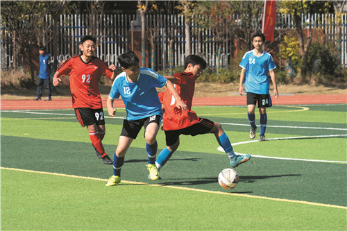 11月28日,在冷水滩区第九届中小学生“四明山杯”校园足球联赛上,学生们在赛场上激烈拼抢。近年来,冷水滩区积极推动校园足球运动发展,通过完善基础设施、开展校园足球社团、举办校园足球联赛等举措,深化体教融合,提升学生体育运动技能,促进青少年健康成长。雷中祥 摄